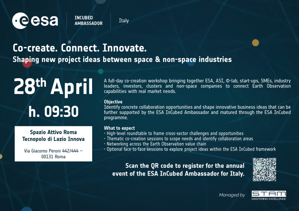 L’iniziativa, organizzata in collaborazione con l’Agenzia Spaziale Europea (ESA), nasce con l’obiettivo di trasformare le potenzialità della Earth Observation (EO) in soluzioni di business concrete, favorendo l’incontro tra player del settore spazio e aziende “non-space”.
