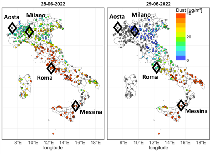 Figura 2 – Esempio dell’output del metodo DIAPASON per due giornate affette dal trasposto di polveri desertiche sul nostro paese (28–29 giugno 2022) in cui si riportano i valori medi giornalieri di dust–PM10 stimati sui siti di monitoraggio della qualità dell’aria in Italia. I simboli a forma di diamante indicano alcune città italiane selezionate (da Nord a Sud: Aosta, Milano, Roma, Messina) dove sono state effettuate misure di verifica e/o confronti con dati indipendenti (VEDI FIGURE 3 e 4)