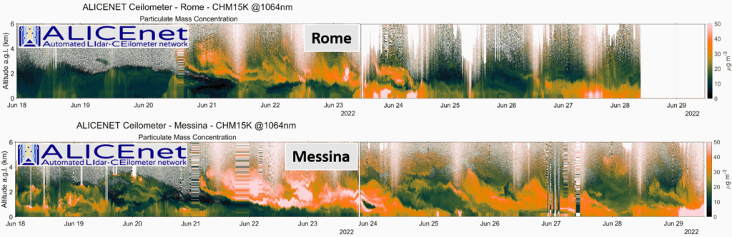Figura 3 – Profili verticali di PM10 (0-6 km di altitudine, asse y) tra il 18 e il 29 giugno 2022 (asse x) nei siti di Roma (in alto) e Messina (in basso) ricavati da sistemi di telerilevamento automatici di tipo Lidar-Ceilometer operanti all’interno della rete italiana ALICENET (alice-net.eu).