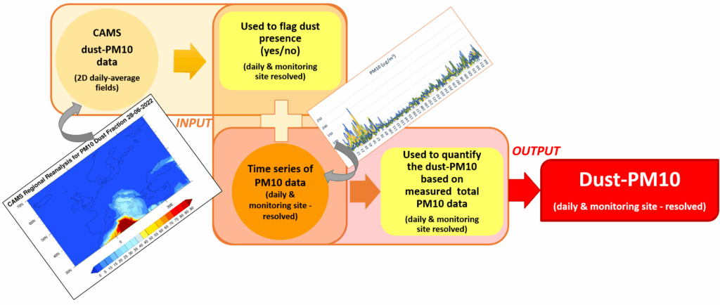Figura 1 – Lo schema del metodo DIAPASON per stimare il PM10 di origine desertica combina i dati modellistici di dust–PM10 del CAMS con i valori medi giornalieri di PM10 rilevati nella rete di monitoraggio della qualità dell’aria per ricavarne stime di dust-PM10 per ogni giorno affetto da eventi di trasporto di queste polveri e per ogni sito di monitoraggio.