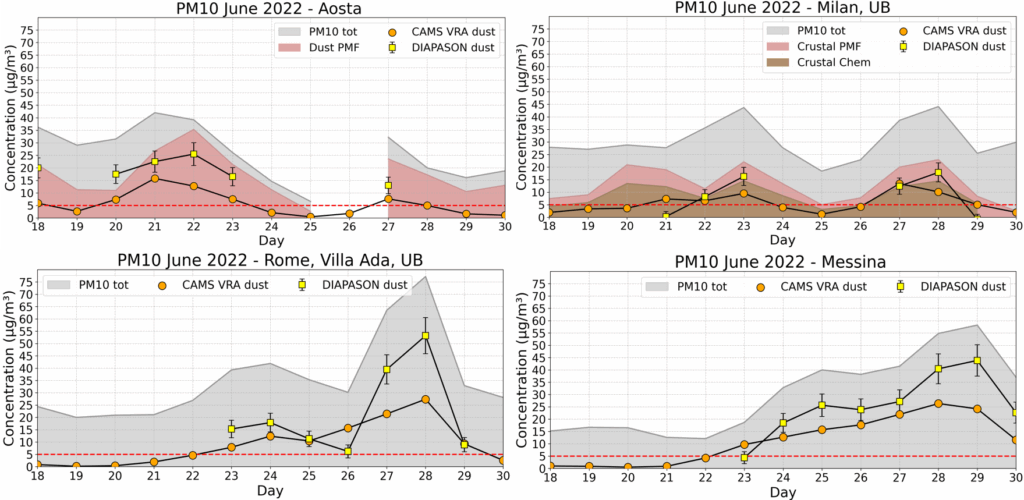 Prendendo come base tali ‘Linee Guida’, nell’ambito di un progetto Europeo Life+ (DIAPASON), è stato sviluppato in Italia un metodo automatizzato per stimare il contributo della polvere desertica al PM10 (Barnaba et al., 2017) sulla base delle misure standard di qualità dell’aria. In particolare, questo metodo combina previsioni modellistiche delle polveri desertiche con le misurazioni effettive di PM10 effettuate nelle centraline di monitoraggio sul territorio nazionale. Il metodo DIAPASON è stato già applicato su dataset multi-annuali (Barnaba et al., 2022) e dal 2024, è stato adottato come strumento ufficiale dal Ministero dell’Ambiente e della Sicurezza Energetica italiano come strumento di supporto per il reporting annuale alla Commissione Europea in materia di qualità dell’aria.